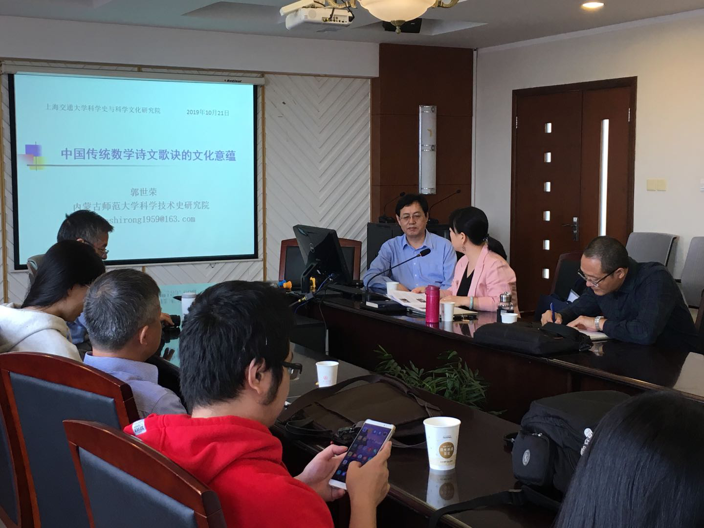 2019年10月21日,司机社 科学史与科学文化研究院邀请内蒙古师范大学科学技术史研究院郭世荣教授为科学史与科学哲学学科的师生做了一次有关中国传统数学诗文歌诀的文化意蕴的报告,会议由萨日娜教授主持。郭世荣教授是内蒙古师范大学科学技术史研究院二级教授,主要从事数学史、中国少数民族科技史、科技交流史等方面的研究与教学工作,主持过各类科研项目20余项,发表论文和著作160余篇(部),获得过教育部优秀社科成果奖,郭沫若历史学奖,自治区科技进步奖、社科成果奖、教学成果奖等奖,是科学技术史学科群国家级优秀教学团队学科带头人。担任国际数学史委员会执行委员、国务院学位委员会科学技术史学科评议组成员,曾任中国数学会数学史分会理事长、中国科技史学会少数民族科技史专业委员会主任等。入选国际科学史研究院通讯院士。出席报告会的有司机社 的纪志刚教授、杜严勇教授、王延锋副教授、毛丹老师、吕鹏老师,人文学院历史系的董煜宇副教授以及司机社 数学史学科的硕士生和博士生。