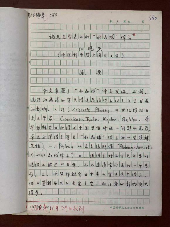 而《天文学史上的水晶球体系》是三份手稿中最“老”的,原载《天文学报》28卷4期(1987),是江晓原发表在《天文学报》上的第一篇论文。全文讨论“水晶球”宇宙体系在古希腊时代的形成;在中世纪成为教会“钦定”的学说;考证了哥白尼、第谷、开普勒、伽利略等人对这一宇宙体系的态度;考证了这一体系从明末起在中国的传播情况及其意义。