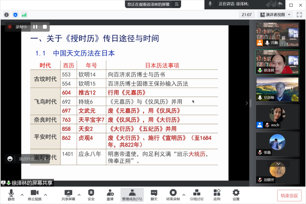 6月15日上午,徐泽林教授的“《授时历》在江户日本”为系列讲座的第二场。《授时历》作为中国传统历法发展史上科技成就最高、对周边影响最大的历法,也是朝鲜、日本学者研究最多的历法,深深影响了朝鲜、日本的传统数理科学的发展。徐泽林教授的报告首先回顾了中国天文历法被日本借鉴学习的经过,梳理了《授时历》从中国传播到日本的时代背景,并考证其传播到日本的具体途径与大致时间。通过对中、日、朝历史文献的记录、日本图书馆收藏授时历的图书信息、和刻本授时历底本的调查,论述《授时历》在日本的传播与影响。在日本学者对《授时历》的研究中,建部贤弘的注解——六卷抄是其中水平最高的科学著作。通过对建部贤弘注解中招差术、“白道交周”、白赤道差算法之“相减相乘法”造术等问题的考察,可以看出建部贤弘的“六卷抄”是东亚各国中唯独对《授时历》的推步方法进行改进,并对古代历法推步方法的造术原理进行分析的科学著作。