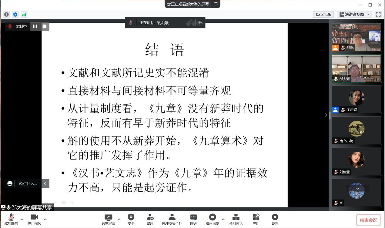 纪志刚教授认为邹大海研究员的报告内容丰富,对典籍、简牍等文献的解读充分扎实,《九章算术》的成书不仅是简单的年代问题,更是文化的问题、社会性的问题,可以与中国古代数学文明的历史探源联系起来,有着重要的学术意义,值得进一步挖掘研究。萨日娜教授认为,今天的报告为大家提供了一个很好的研究范式,研究引经据典、抽丝剥茧、循序渐进,最终通过比较可靠翔实的证据,还原了《九章算术》的成书年代。