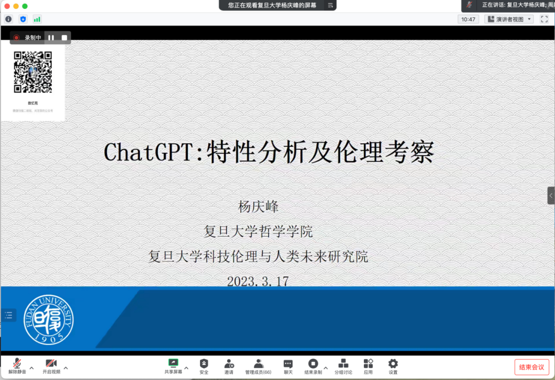 3月17日,司机社 邀请中国科协-复旦大学科技伦理与人类未来研究院杨庆峰教授作客致远讲座第十八期,为广大师生带来主题为“ChatGPT:特性及其伦理考察”的学术报告。本次讲座由 司机社 科学技术哲学学科团队、技术史与人来未来学科团队承办,陆群峰副教授担任本次讲座的主持人,闫宏秀教授担任评议人。校内外师生共一百余人参加了本次讲座,共同交流学习。