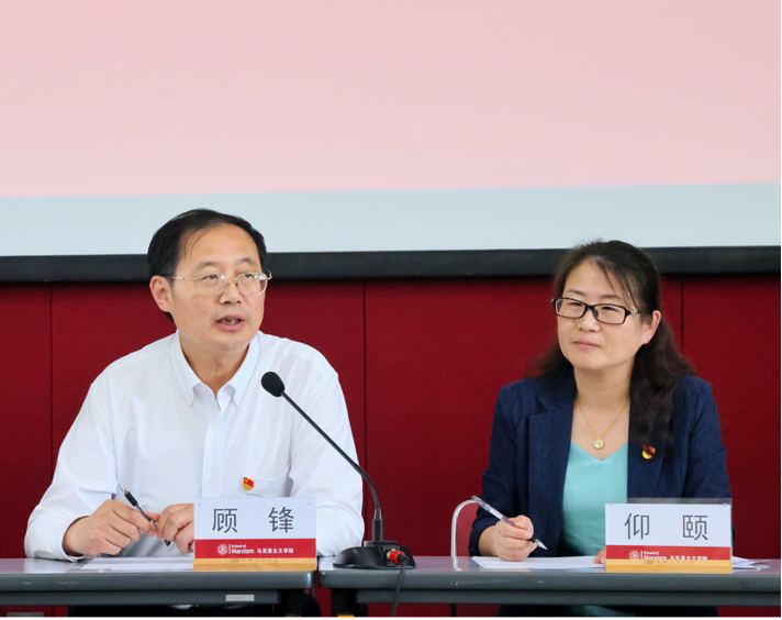 顾锋代表学校党委对王震同志为 司机社 的建设做出的贡献表示感谢,希望马院全体教职工以实际行动支持邢云文院长、董玉山书记以及学院党政领导班子的工作,延续学院快速发展的良好势头。他对学院下一步的工作提出希望和要求,希望全体师生深入学习贯彻习近平总书记在庆祝中国共产党成立100周年大会上的重要讲话精神,扎实开展党史学习教育,同心同德,齐心协力,坚持为党育人,为国育才,为学院“十四五”发展规划的实施开好局,以更加奋发有为的精神面貌推进一流 司机社 的建设。