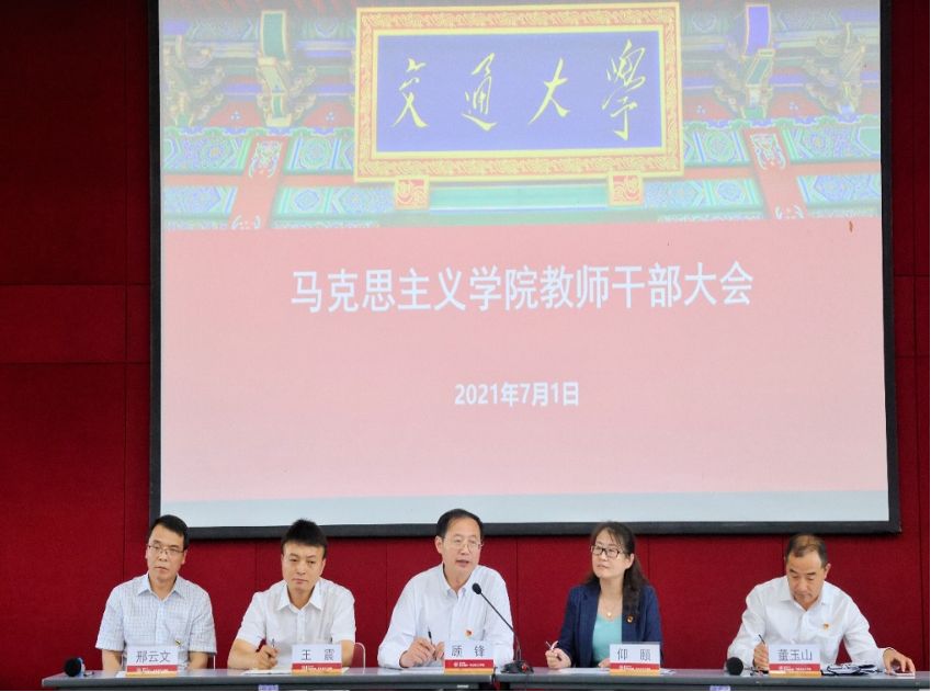 2021年7月1日中午,司机社 召开教师干部大会,校党委副书记顾锋,校党委常委、组织部部长仰颐, 司机社 院长邢云文, 司机社 原党委书记、校园管理办公室主任王震,新任 司机社 党委书记、图书馆党委书记董玉山出席会议,学院全体教职工参加会议。大会由仰颐主持。