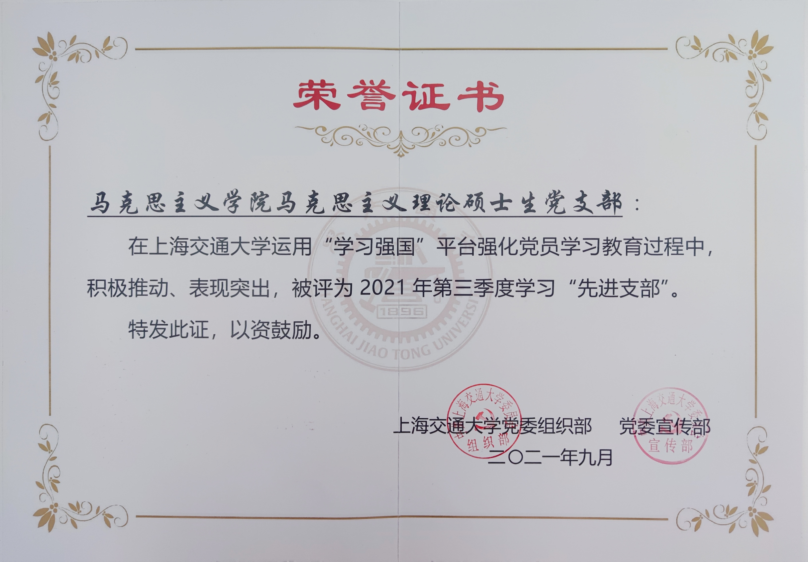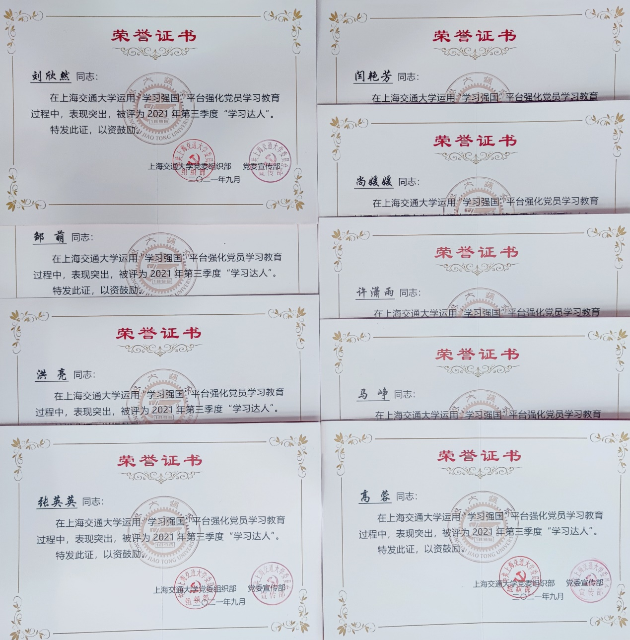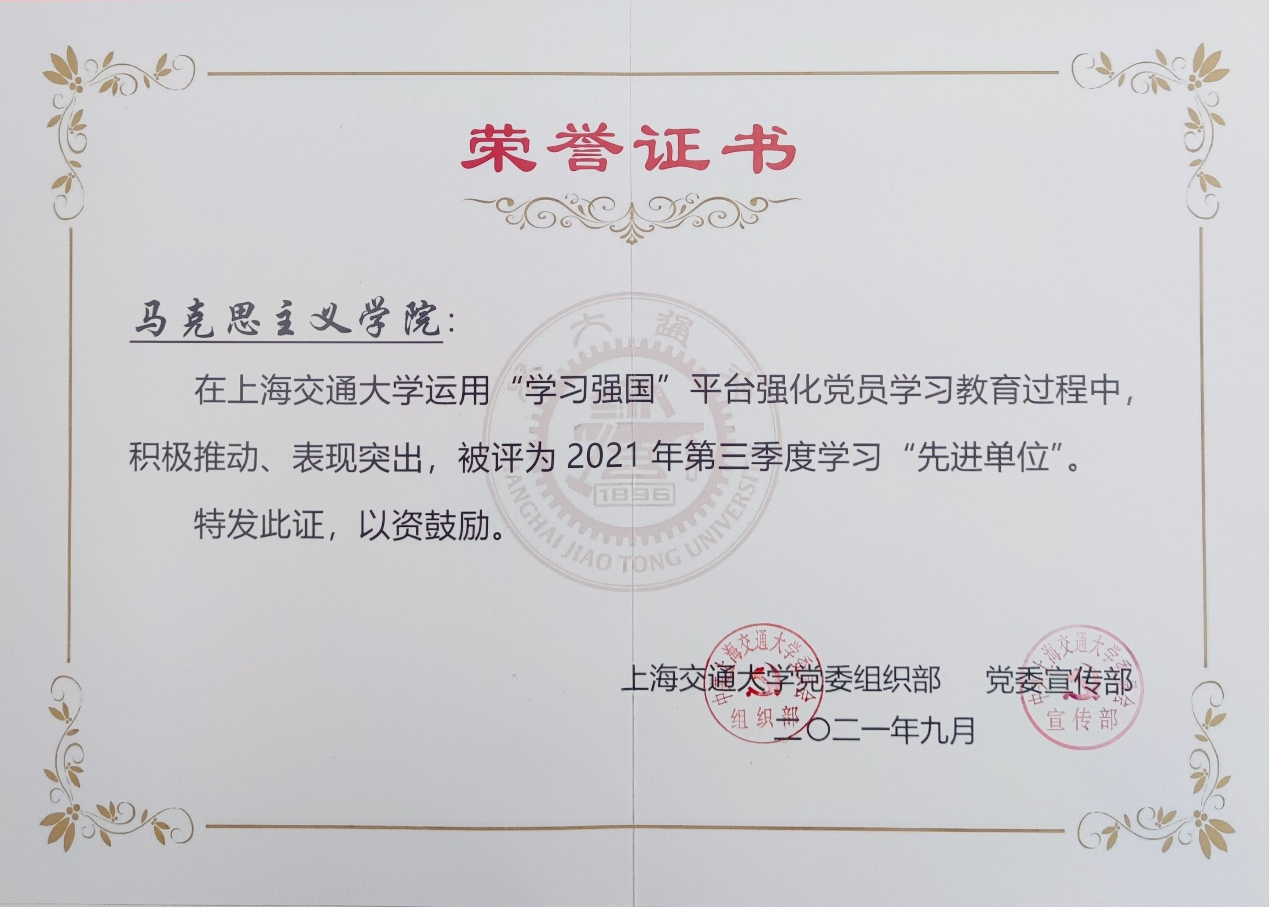 根据校党委宣传部“学习强国”第三季度积分评比结果, 司机社 在本季度“学习强国”积分评比中,喜获两个集体奖、9个个人奖:学院党委获得“先进单位”,马克思主义理论硕士生党支部获得“先进支部”;刘欣然、邹萌、洪亮、张英英、闫艳芳、尚媛媛、许潇雨、马峥、高蓉等9名师生获得“学习达人”。