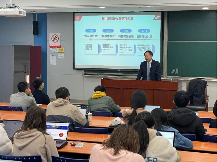 奚立峰紧紧围绕中国科技发展这一主线,与同学们一起回顾了新中国科技发展进程中的关键时间节点和标志性成果。他指出,从“向科学进军”到“科教兴国”再到“创新驱动发展”,我们党始终把科技创新作为提高社会生产力和综合国力的战略支撑。70多年以来,我国科技水平稳步提升,创新要素充分涌流,极大推动了社会快速发展。但是,我们也应注意到,在部分领域,我国与发达国家仍存在一定差距。他强调,要用全局性、前瞻性的眼光辩证看待我国科技发展取得的成就和面临的挑战,“补短板、强弱项、固优势”或将成为未来我国科技发展的“组合拳”。