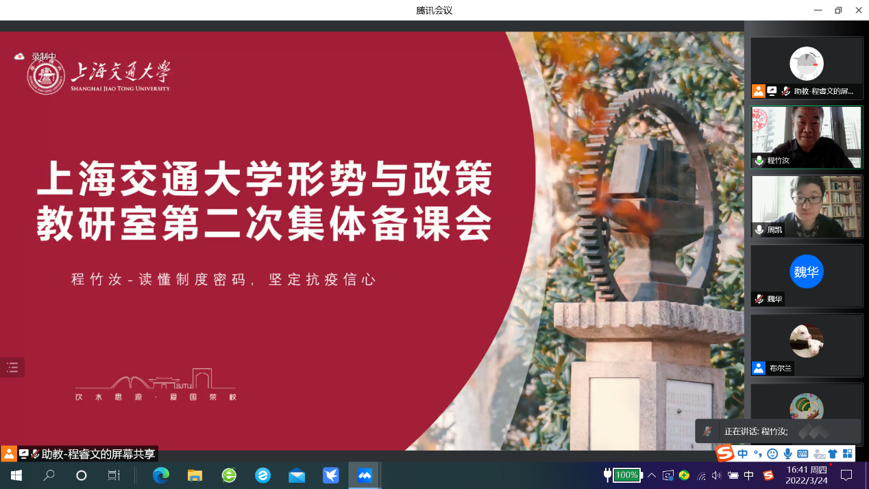 在疫情防控的关键时期,如何将鲜活的校园抗疫故事与抗疫中迸发出的“交大精神”等有机融入教学,成为“形势与政策”课开展线上教学必须认真思考的问题。3月24日,“形势与政策”教研室以“读懂制度密码,坚定抗疫信心”为主题,在线召开了2022年春夏学期第二次集体备课会。