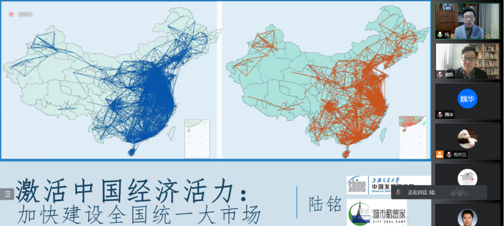 2022年4月10日,《中共中央国务院关于加快建设全国统一大市场的意见》发布,为及时引导学生有效掌握“全国统一大市场”蕴含的知识点,陆铭教授从多角度、多维度充分阐释“全国统一大市场”背后的逻辑框架,深入解读其核心要义和重点问题,并与参会教师进行交流互动。