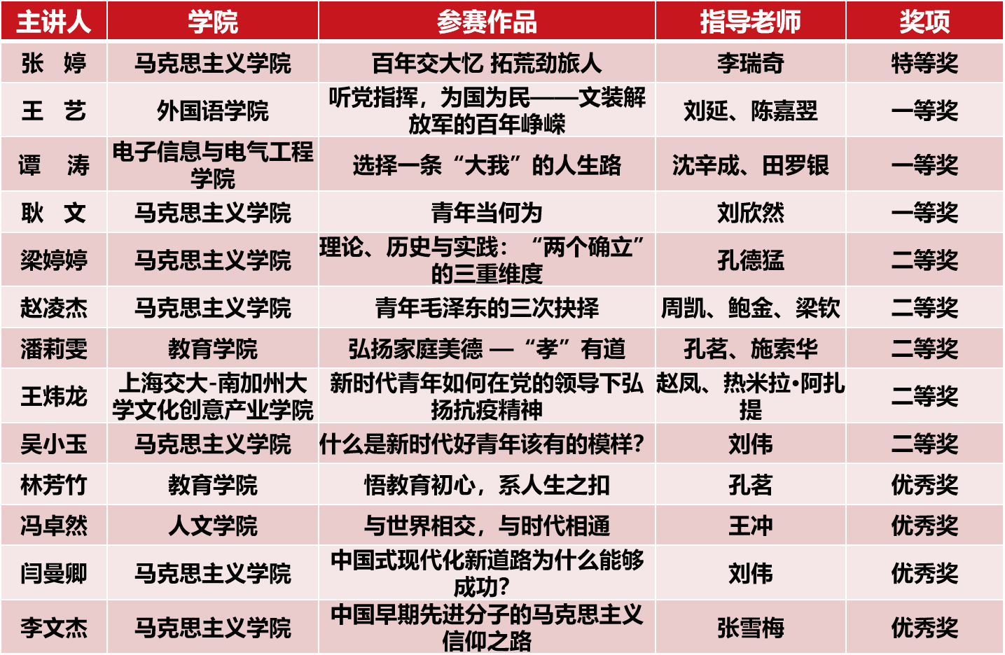 周承表示,首届大学生讲思政课比赛意在鼓励交大学子讲好中国故事、传递好青年声音,把当代中国马克思主义的道理讲深、讲透、讲活。这既是学校更好发挥思政课立德树人关键课程作用的创新探索,也是坚持不懈用习近平新时代中国特色社会主义思想铸魂育人的重要举措。希望参赛选手充分展现当代大学生朝气蓬勃、富有活力的青春风采,立志在青春的赛道上跑出当代青年的最好成绩,以实际行动迎接党的二十大胜利召开。