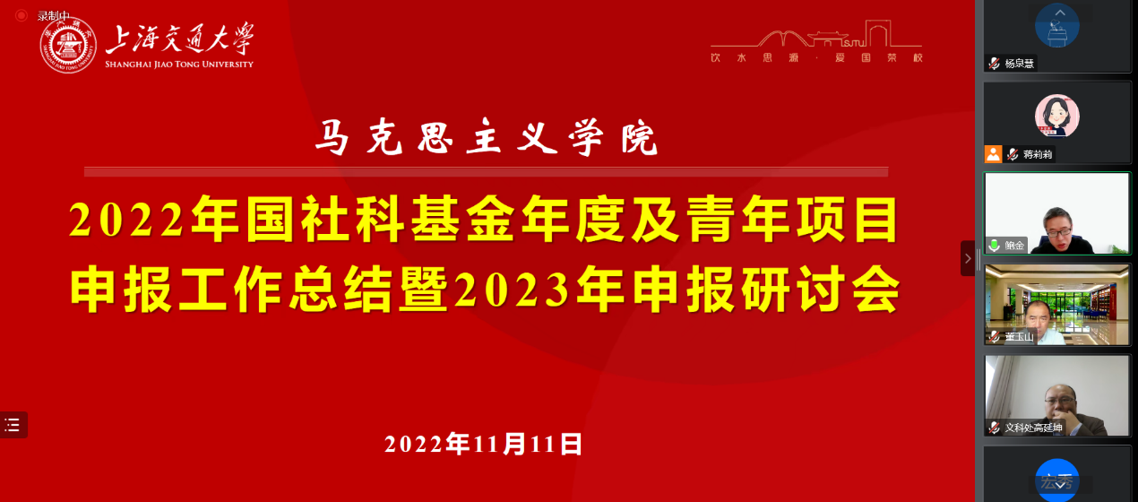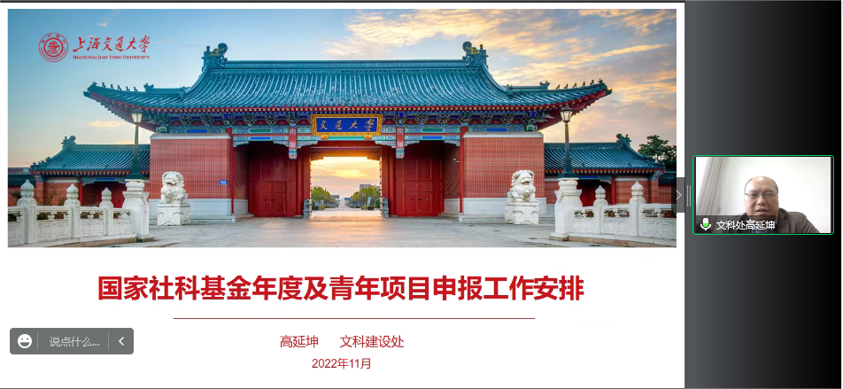 为强化有组织科研,切实做好国社科基金申报工作, 司机社 于11月11日召开2022年国社科基金年度及青年项目申报工作总结暨2023年申报研讨会。文科建设处副处长高延坤、项目管理中心主任黎晓玲, 司机社 党委书记董玉山、副院长鲍金、教授黄伟力及相关老师近40人参加了会议。会议由鲍金主持。