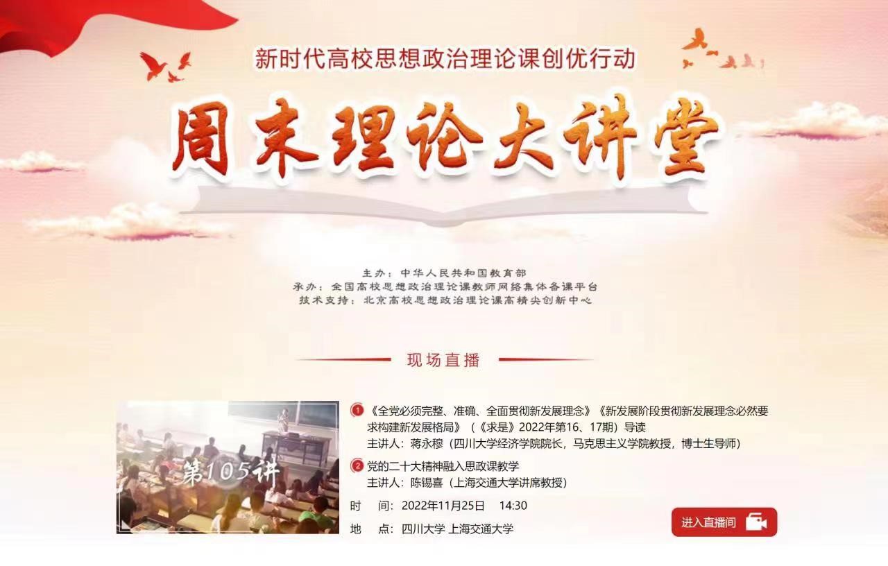 11月25日下午,司机社 讲席教授陈锡喜应邀在教育部主办、全国高校思想政治理论课教师网络集体备课平台“周末理论大讲堂”,以“党的二十大精神融入思政课教学”为题为全国高校思想政治理论课教师作了报告。
