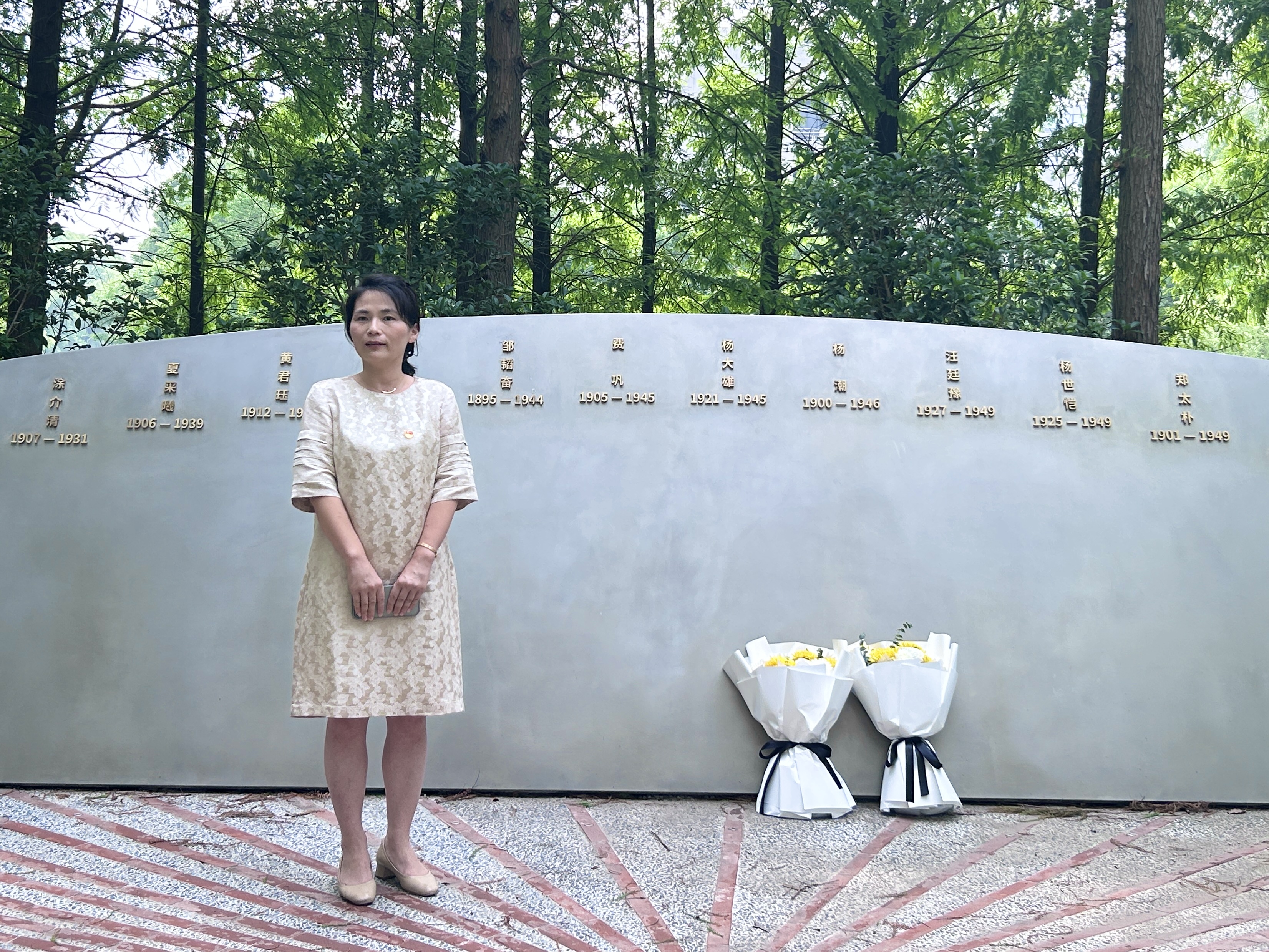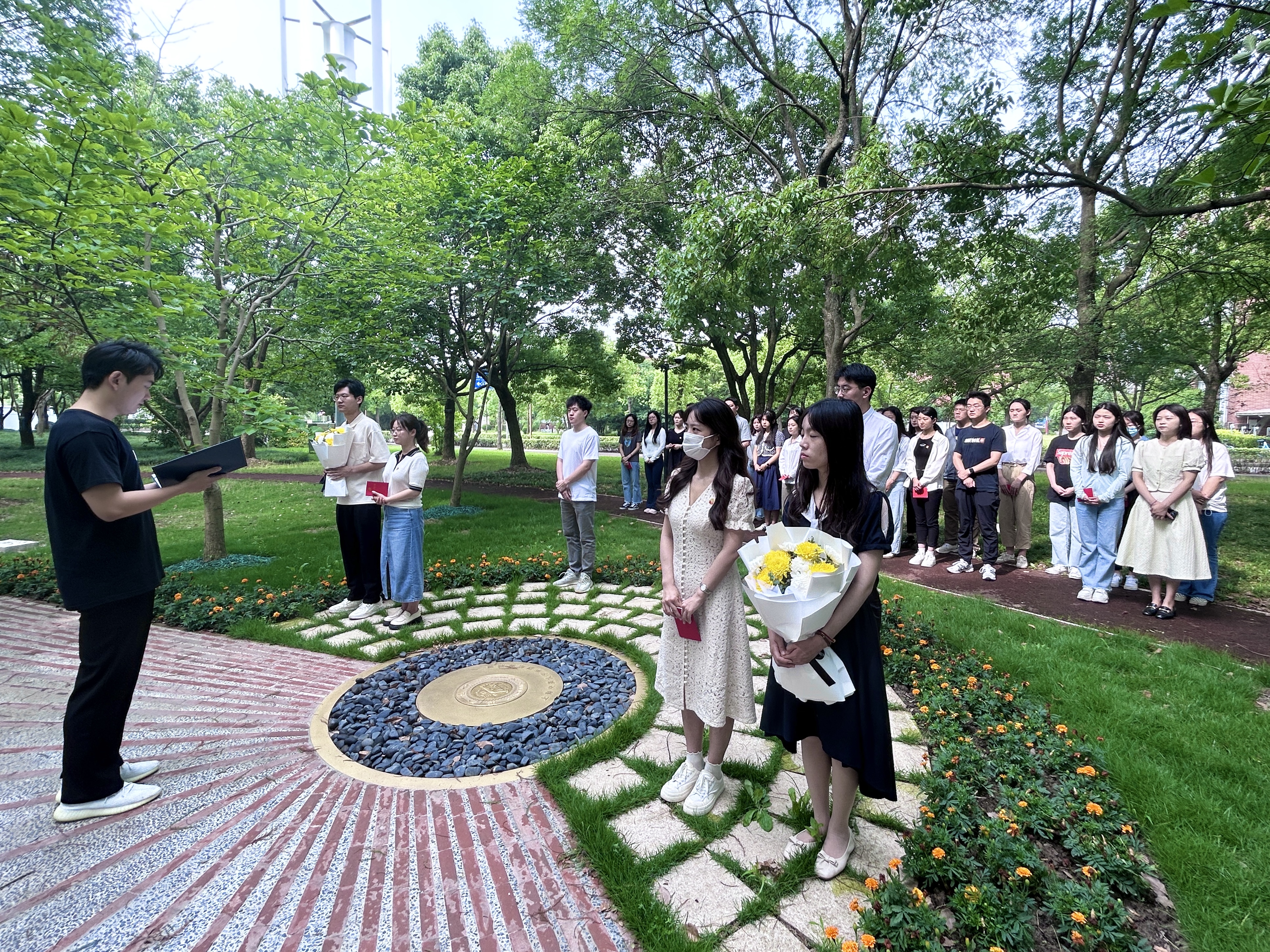 在庄严肃穆的英烈纪念雕塑前,新发展党员代表蒋鹏宇、林嘉悦手捧鲜花,缓步向前,向革命英烈敬献花束。马克思主义理论2021级硕士生党支部新发展党员林嘉悦表示,“我有幸作为新发展党员代表,为革命英烈们献上花束与敬意。‘小我’的生命是有限的,但是‘大我’的生命是不朽的。我们立志接续先辈们爱党爱国的革命精神,像一滴水汇入大海般,形成浩瀚无垠的‘大我’力量。”