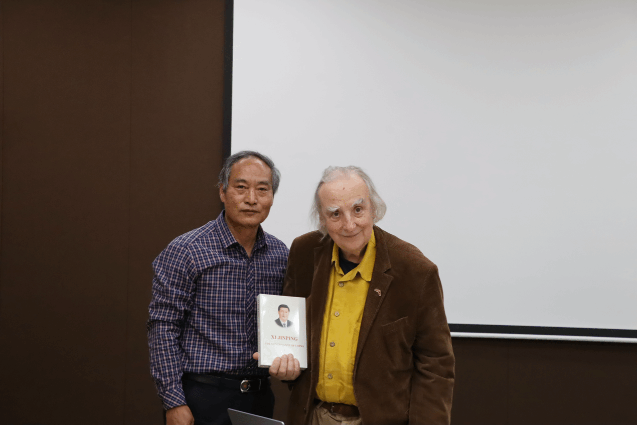 第四场报告题为“马克思主义理论的返本开新”。沃尔夫教授详细阐释了自己“有限马克思主义”的理论构想,提出马克思主义是一种指导理论而非僵化教条,需要在各民族国家的政治实践中进行本土化创造。随后卜祥记教授与沃尔夫教授展开交流,表示中国式现代化进程的实践恰好证实了沃尔夫教授的这一观点。讲座尾声,卜祥记教授代表 司机社 向沃尔夫教授赠送《习近平谈治国理政》(英文版)一书,本次讲座在掌声雷动的热烈气氛中圆满闭幕。