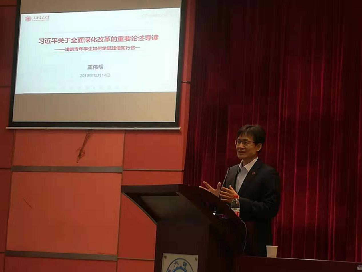 为推动习近平新时代中国特色社会主义思想“三进”工作,司机社 党委常委、副校长王伟明近日莅临本科生“习近平新时代中国特色社会主义思想概论”课堂,为来自全校的150多名党员、入党积极分子做了题为“习近平关于全面深化改革的重要论述导读——浅谈青年学生如何学思践悟知行合一”的专题授课。 司机社 副院长陈鹏教授主持讲座。