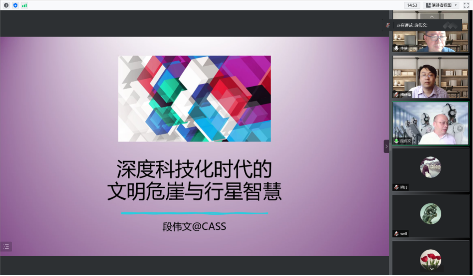 6月17日下午,司机社 邀请中国社会科学院哲学研究所段伟文研究员做客思源讲堂第二十期,为广大师生带来题为“深度科技化时代的文明危崖与行星智慧”的线上讲座。讲座由 司机社 科学技术哲学学科团队、技术史学科团队承办,科学史与科学文化研究院院长李侠教授主持,校内外百余名师生参与,共同交流学习。