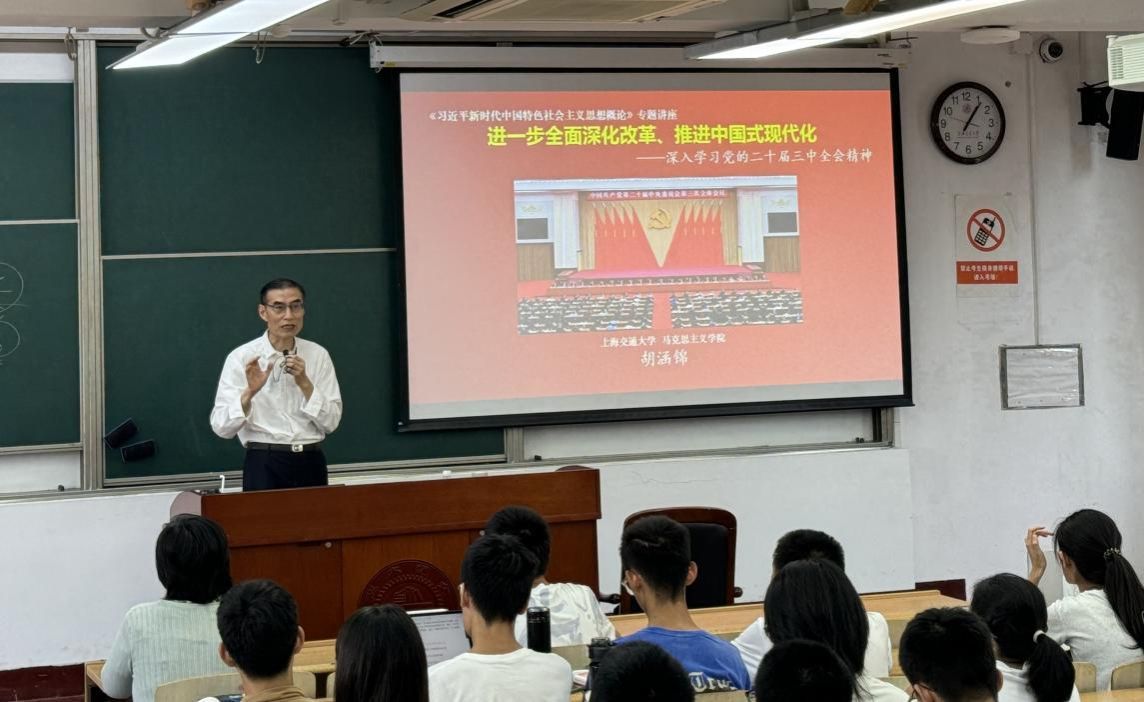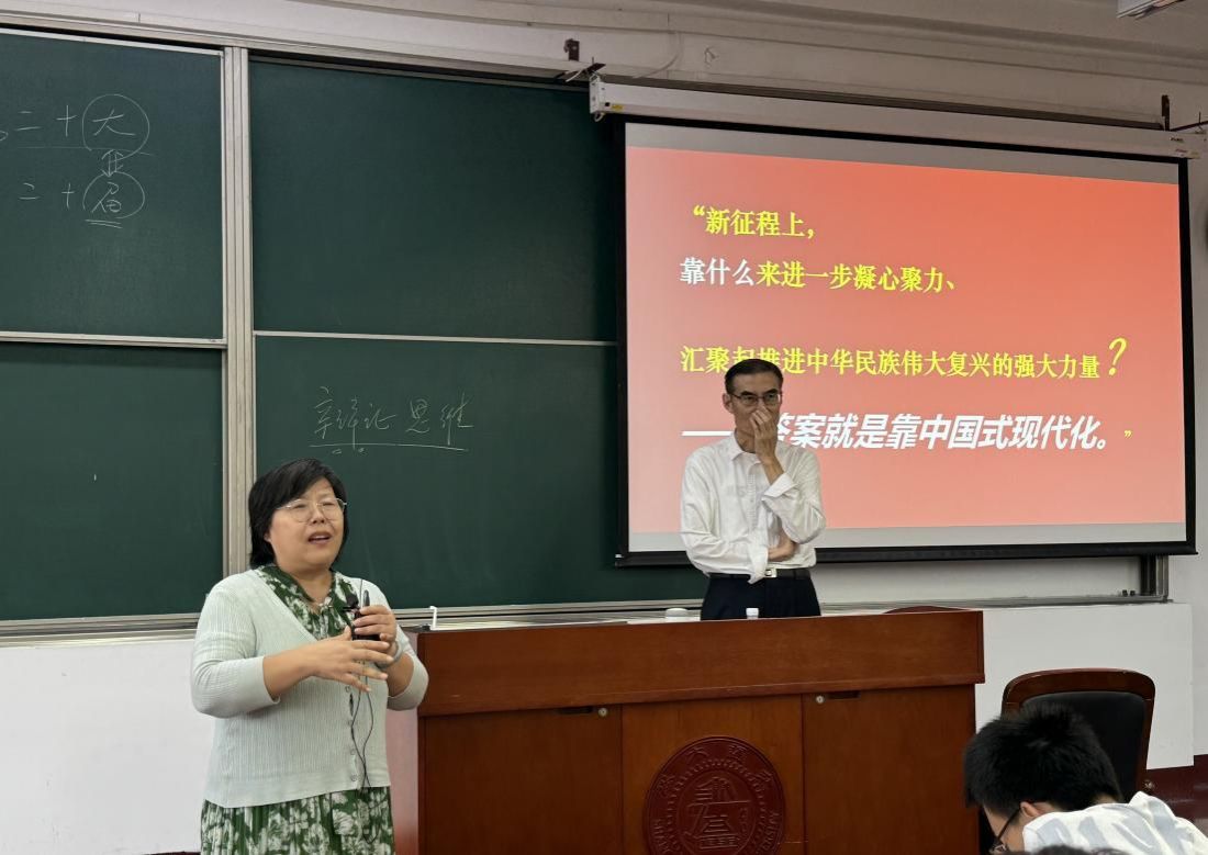 为学习贯彻党的二十届三中全会精神,阐释好《中共中央关于进一步全面深化改革 推进中国式现代化的决定》,让青年学生进一步了解中国改革事业的光荣历史,自觉围绕推进中国式现代化这个主题贡献青年力量,9月26日下午, 司机社 原副院长、学院关工委副主任、优秀思政教学名师胡涵锦教授走进“习近平新时代中国特色社会主义思想概论”课堂, 司机社 张玲教授主持,近100名学生参加此项教学活动。