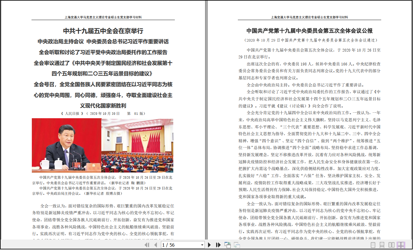 自十九届五中全会召开以来, 司机社 马克思主义理论专业硕士生党支部多措并举推进全会精神贯彻落实,专门汇总关于十九届五中全会的学习材料下发给支部党员与积极分子,推进全会精神在支部落地生根。