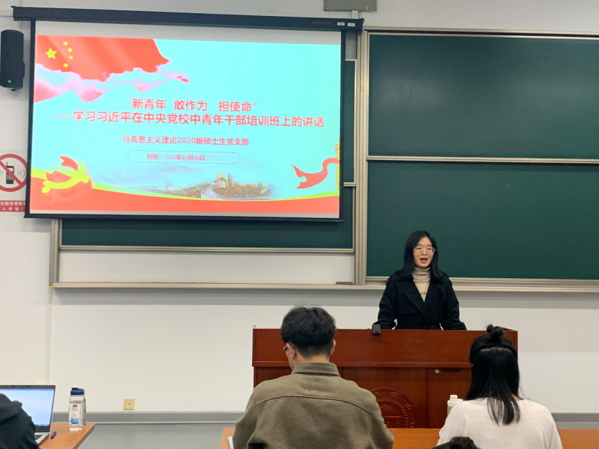 10月26日晚,2020级马克思主义理论硕士生党支部就习近平总书记在中央党校中青年干部培训班上的讲话内容在陈瑞球楼104教室举行了集中学习活动,本次活动由党支部书记程惠芬同志主持,支部23名党员同志和积极参与活动的其他2020级马理论硕士同学参加。
