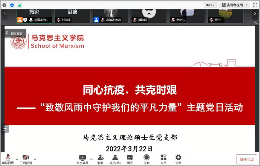杨振家感谢学院党委和高福进老师对支部工作的支持和关心,代表支部向所有奋战在疫情防控一线的老师和志愿者致敬,希望支部党员能够在疫情防控中勇担使命,力所能及地做些贡献,彰显交大马院学生党员的担当。