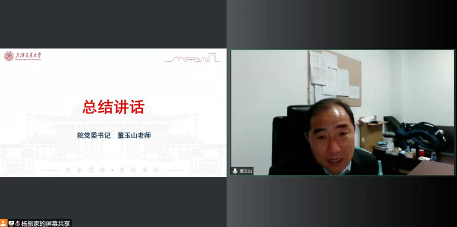 在同学们发言完后,董玉山作总结发言。他首先感谢高福进老师在百忙中给同学们带来的精彩讲述,感谢老师和同学们对学校疫情防控工作的支持,希望同学们牢记自己作为交大人的使命与担当,在困难当头敢于亮明自己的党员身份,充分体现马院学生党员的积极性。