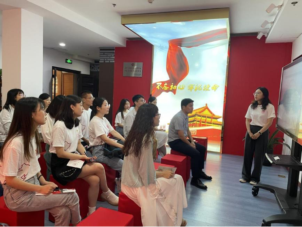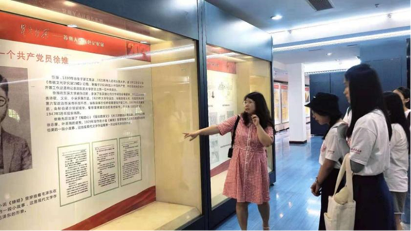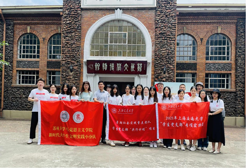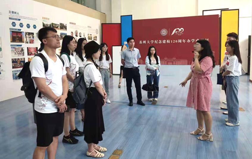 7月17日上午,实践团一行来到苏州大学,与苏州大学 司机社 研究生会和学生理论宣讲团就学生党建和理论宣讲方面的议题进行交流。在苏州大学博物馆朱兰老师的引领与讲解下,实践团一行依次参观了“星火燎原”苏州大学红色记忆展、苏州大学党员英烈生平事迹展、“跨越百年的流芳”主题展览,深刻感受到苏州大学这所百年老校中蕴藏的红色革命精神以及中国共产党人敢于担当、甘于奉献的光荣传统和优良作风。