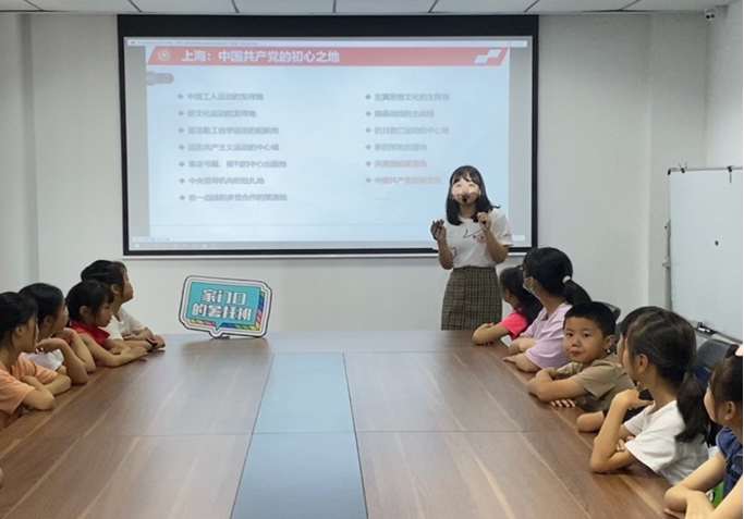 在社区举办的暑托班里,实践团成员、“声入人心”学生理论宣讲团成员马峥为小朋友们带来了一场题为《渔阳里石库门中走出的中国共产党人》的理论宣讲。